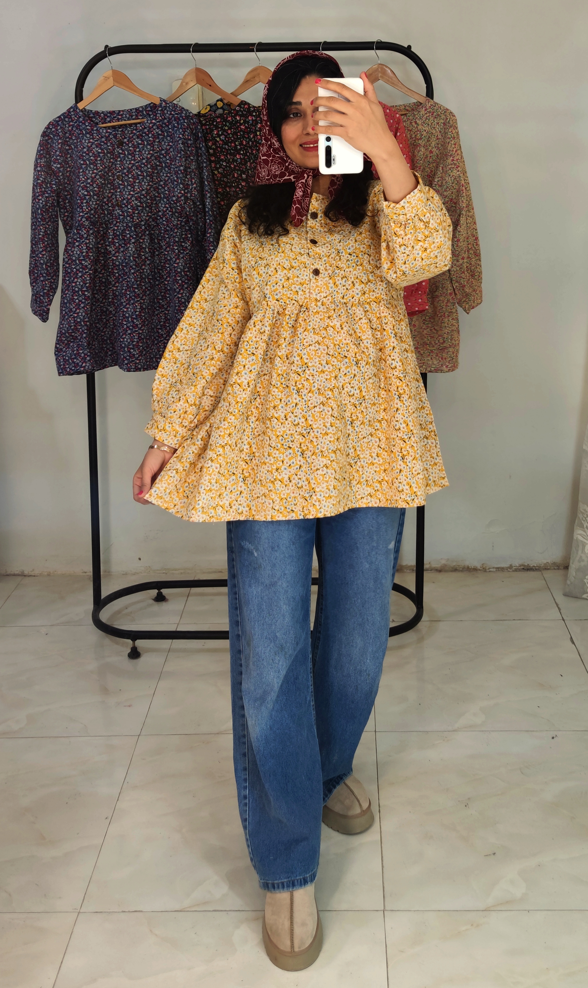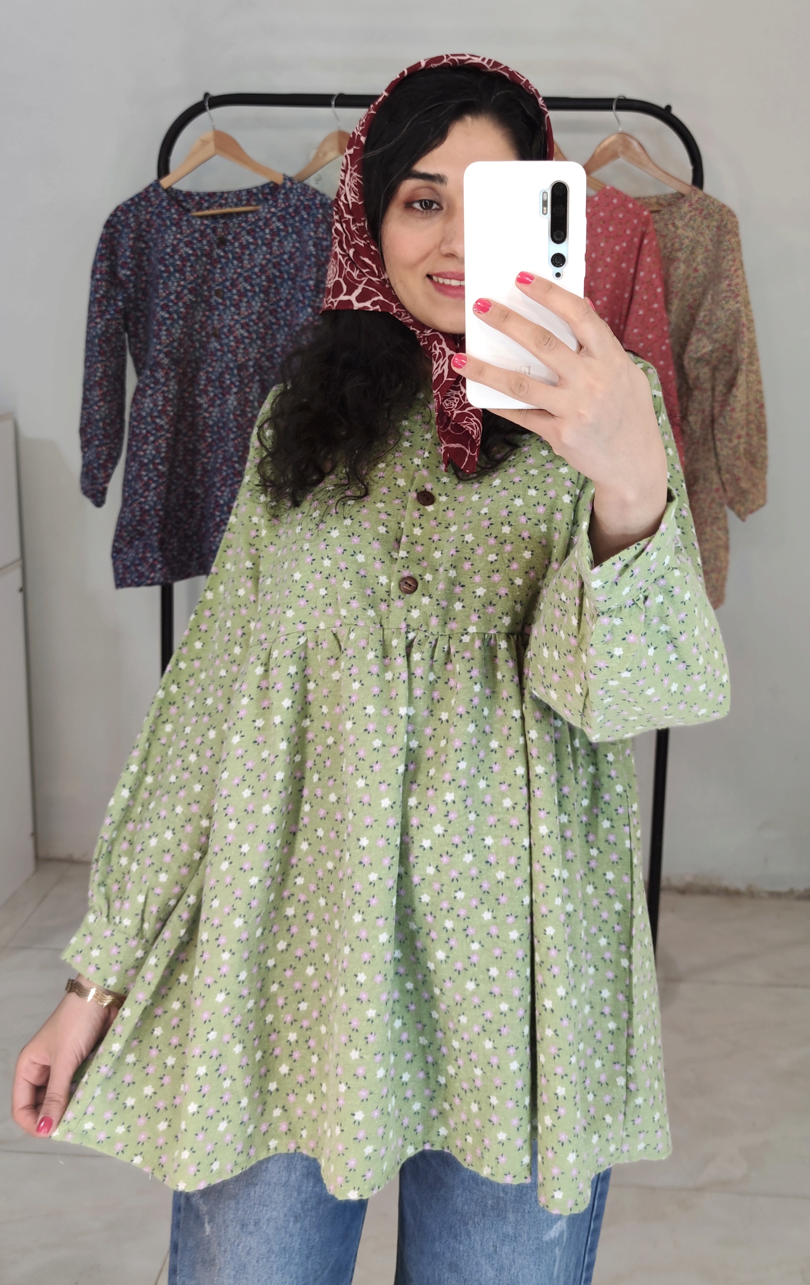 شومیز آیلا لینن کرکی و فری سایز است . جلو لباس تا کمر دکمه میخورد .مچ لباس دکمه میخورد و همچنین کمر شومیز دور تا دور چیندار است . این لباس در عین راحتی و آزاد بودن بسیار زیبا و شکیل است .