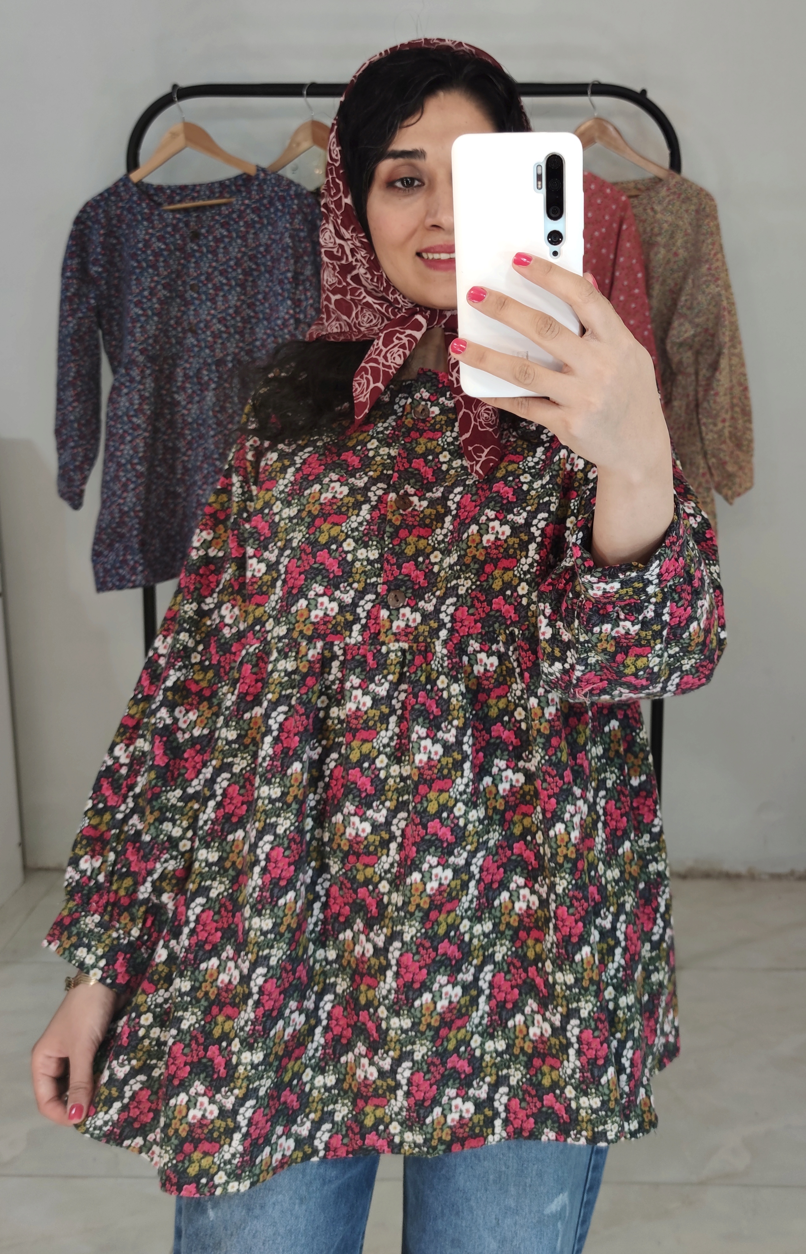در نظر داشته باشید: جلو شومیز تا کمر دکمه میخورد.